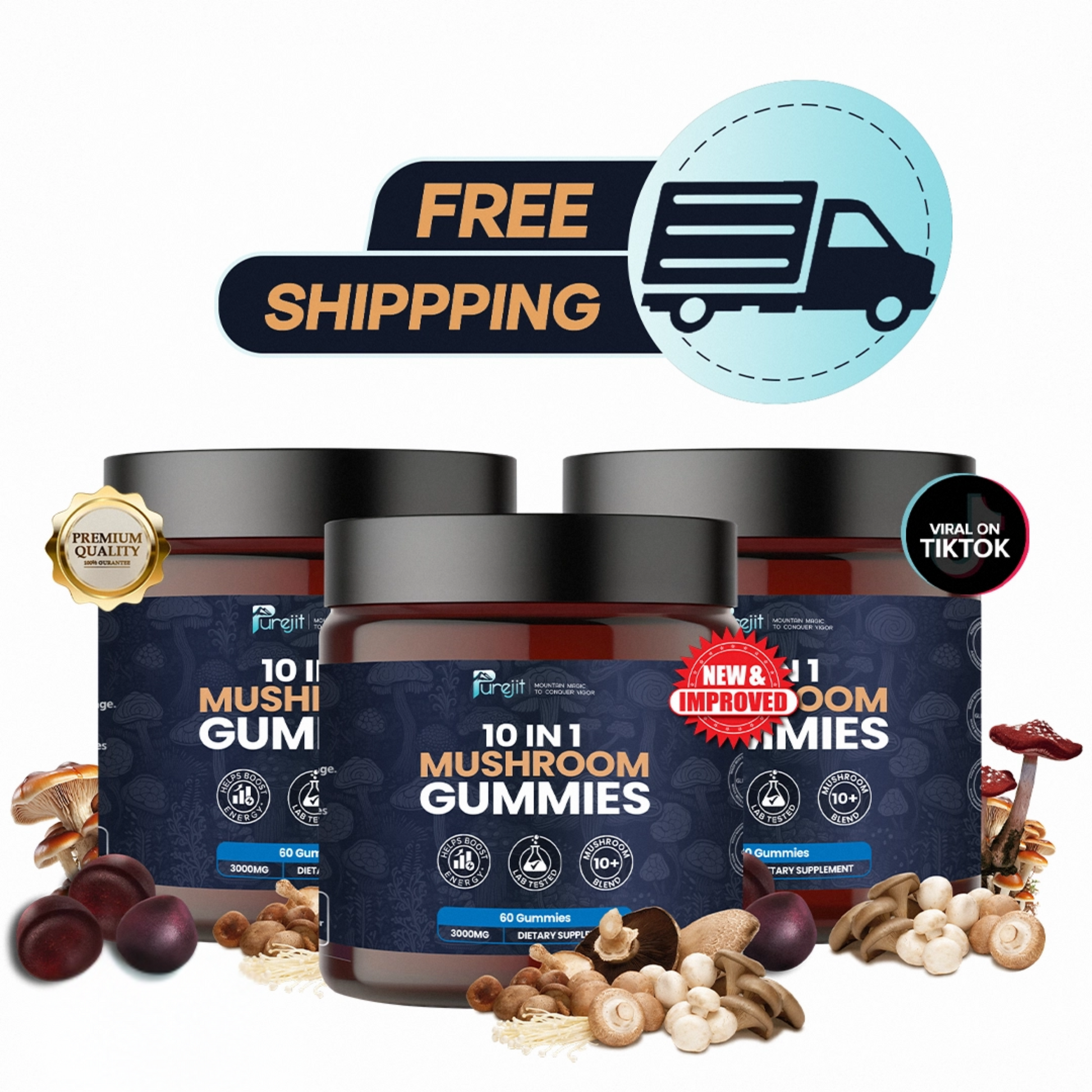10 Mushrooms: Maitake, Shiitake, Lion's Mane, Reishi, Cordyceps, Chaga, Turkey Tail, White Button, Black Fungus, Royal Sun, Glucose Syrup, Sugar, Glucose, Pectin, Citric Acid, Natural Raspberry Flavor, Sodium Citrate, Purple Carrot Juice Concentrate, Vegetable Oil (with Carnauba Wax)