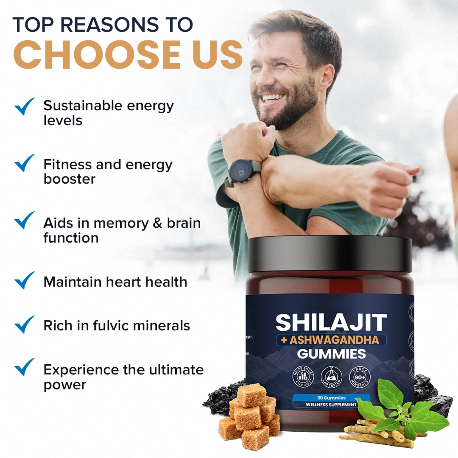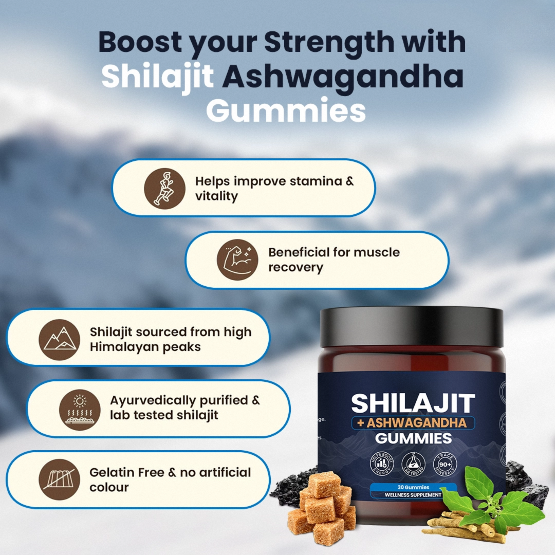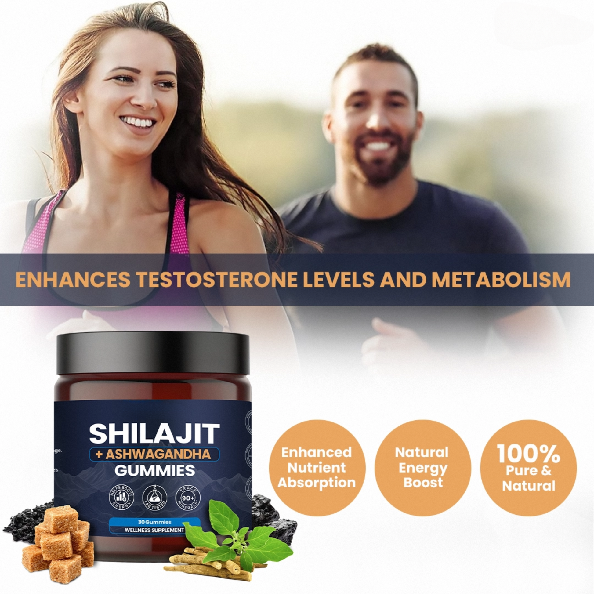 Our Pure Himalayan Shilajit and Ashwagandha supplement gummies contain over 85 trace minerals and are rich in fulvic and humic acid. It’s bioactive elements provide a comprehensive single-dose solution filled with iron, iodine, copper, zinc, magnesium, potassium and more. Contains natural properties that can boost stamina, help men and women live every moment with energy.