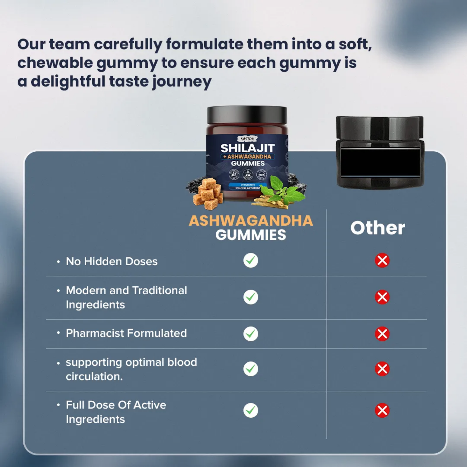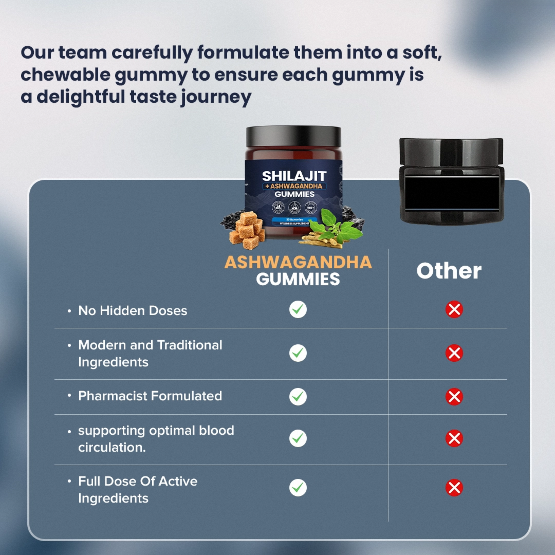 Our Shilajit and Ashwagandha Gummy uses a special natural blend where nutrients combine seamlessly, just like in vegetables and fruits. This helps your body absorb vitamins and minerals better than regular pills or concentrates.